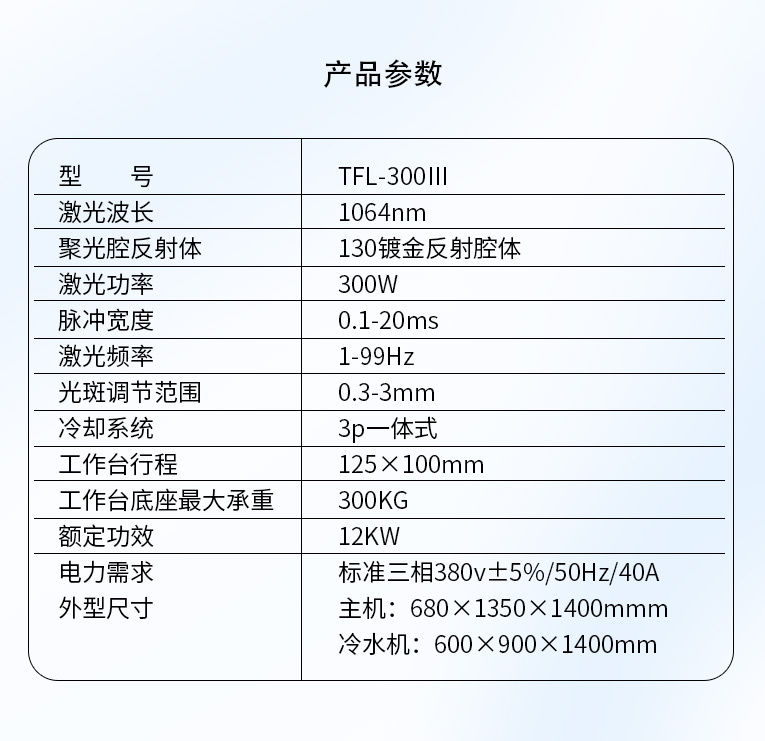 環境溫度:攝氏4度-攝氏32度。設備運行時,環境溫度不可以超過攝氏32度,因為激光電源部分,功率很高,一些功率器件運行時發出熱量需要及時散發出去,而環境溫度太高會導至不能正常散熱,會引起整個系統的工作不穩定,甚至損壞。而冬天的時候,需要嚴防冷卻水結冰,因為激光晶體、氙燈、聚光腔都充滿了水,結冰會直接導致這些器件的損壞。冬天時如長時間不運行情況下,將腔內的水排空;如再開機前,先重新加水,打開電源空氣開關,先行主機不開,只開水機空機運行10分鐘,等水溫回復到攝氏4 度以上,再開主機。(強烈要求不能將設備放于室外或者低溫結冰的情況下使用,否則極易損壞設備)
