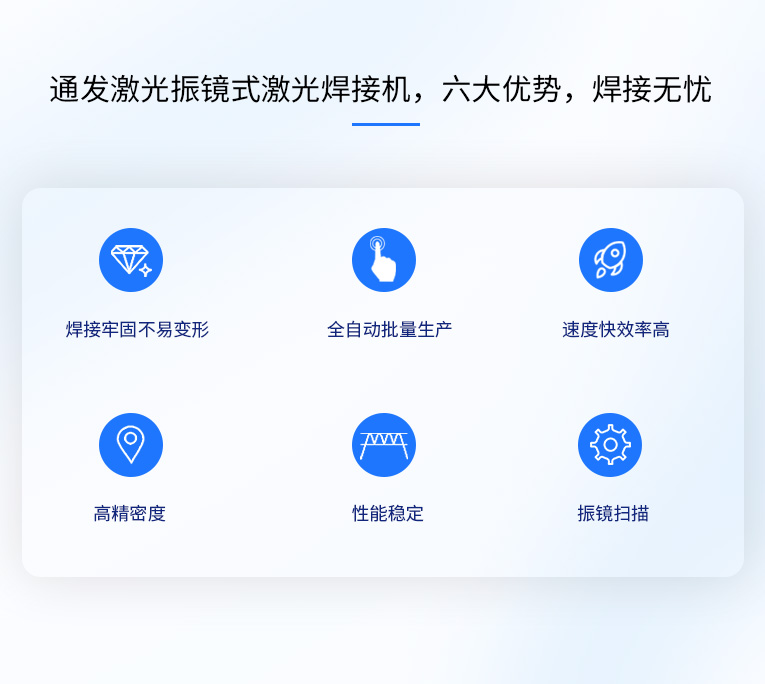 1、采用高速掃描振鏡進行激光定位,速度可達7000mm/s,極大的降低了焊接位置之間的空走時間,從而大大的提高生產效率;